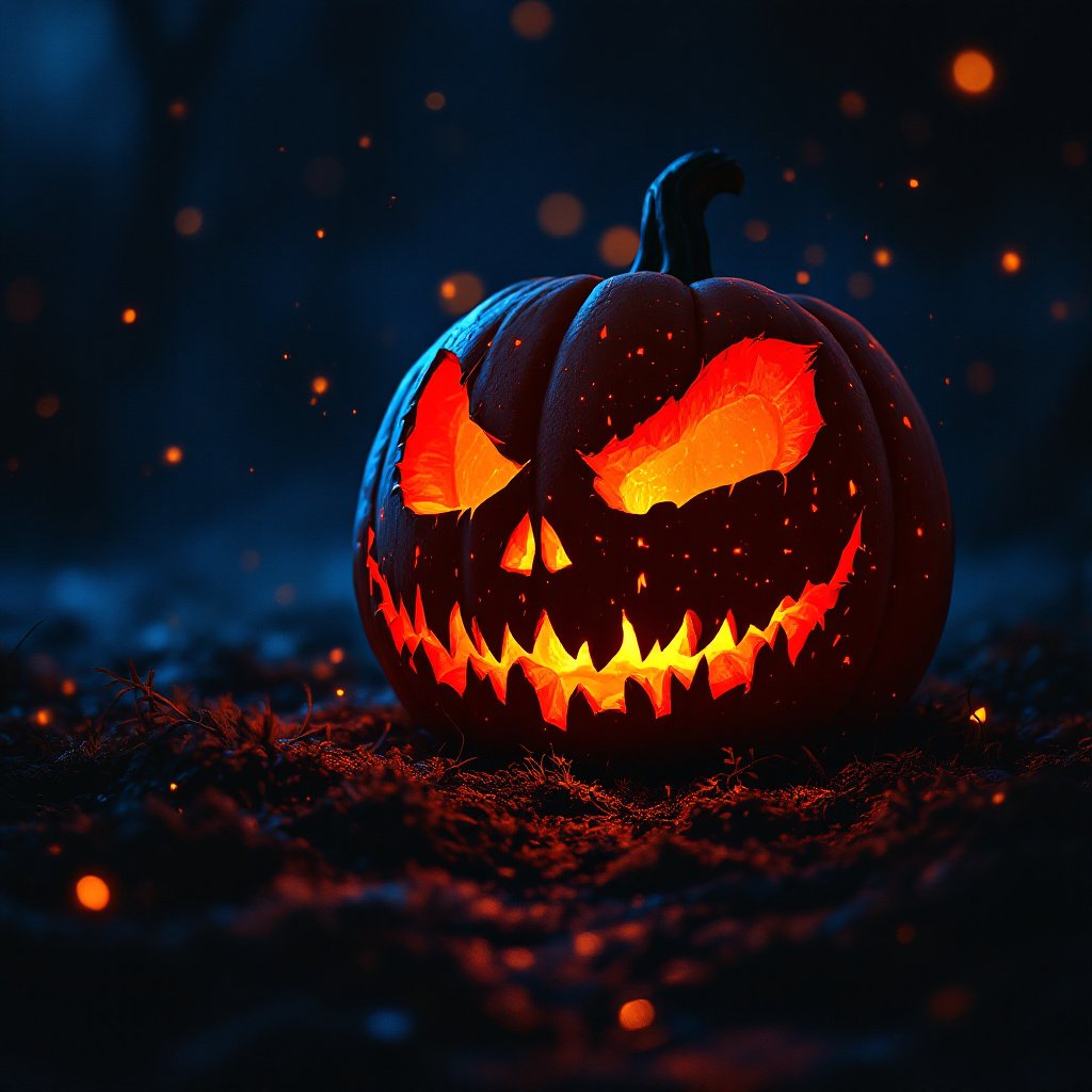 Create a hyper-realistic photograph of a large, intricately carved pumpkin glowing brightly. The scene has a moody atmosphere with deep blue hues and shadows, giving the night an eerie feel. Include scattered energy particles for a touch of magic. The background should feature sharp details with a cinematic dark theme and a bokeh effect to add depth. Focus on the glowing pumpkin as the centerpiece, contrasting its bright orange light with the surrounding darkness.