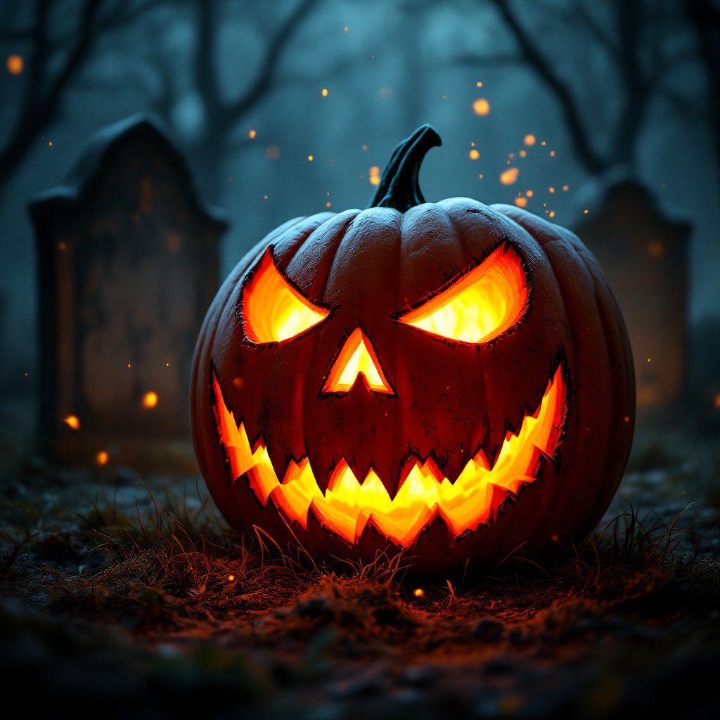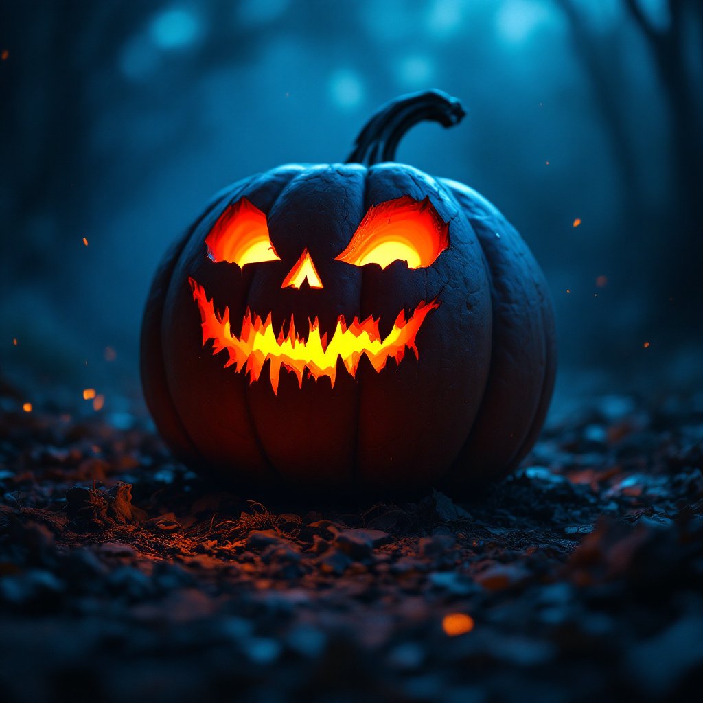 As the cool night air settles in, imagine a spooky Halloween evening where the only light comes from a large, intricately carved pumpkin. This pumpkin is no ordinary jack-o-lantern—it’s hyper-realistic, glowing brightly, casting an eerie orange light that cuts through the dark shadows of a deep blue, moody background. The atmosphere is thick with energy, small particles swirling around, giving the scene a magical yet slightly unnerving feel. The bokeh effect blurs the edges, creating depth and adding to the cinematic quality of this moment. Every detail is sharp, yet the darkness gives the entire scene a mysterious allure, pulling you in closer to admire the craftsmanship of the glowing pumpkin.