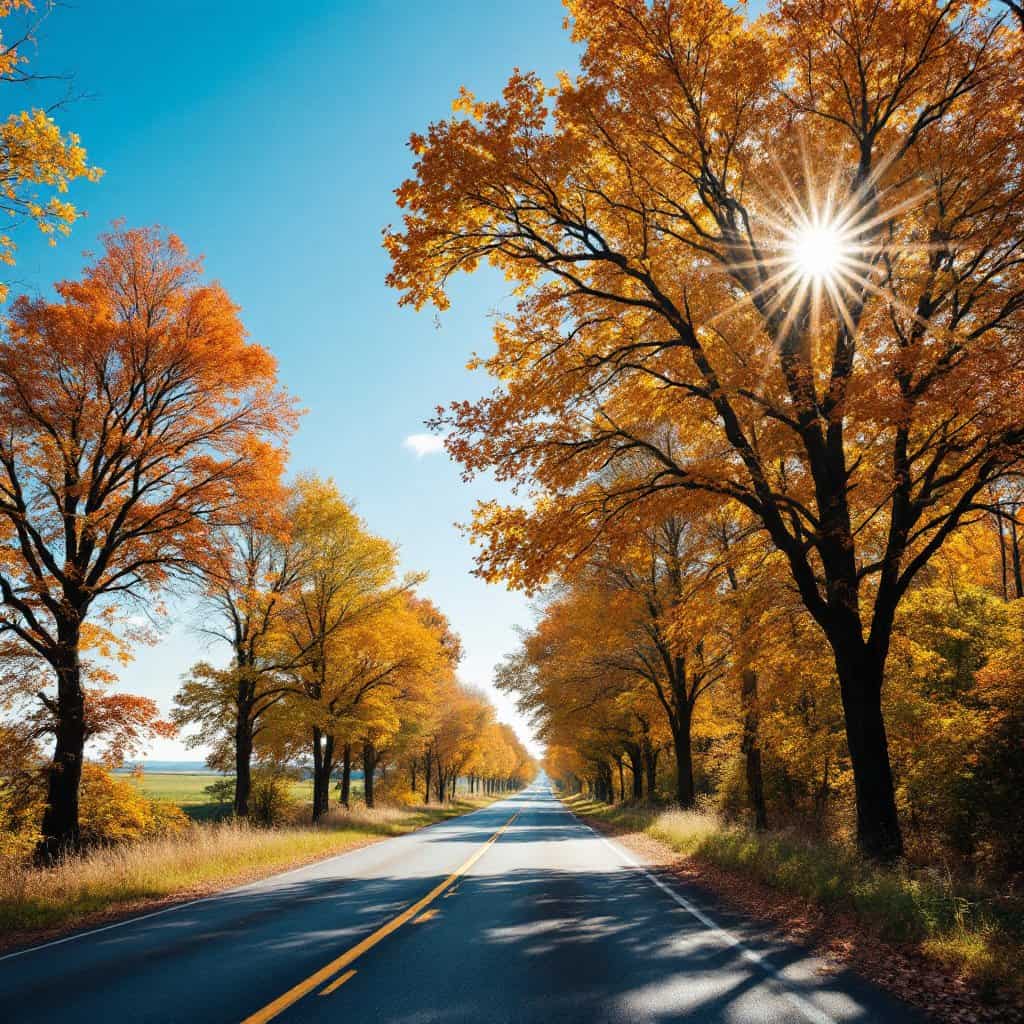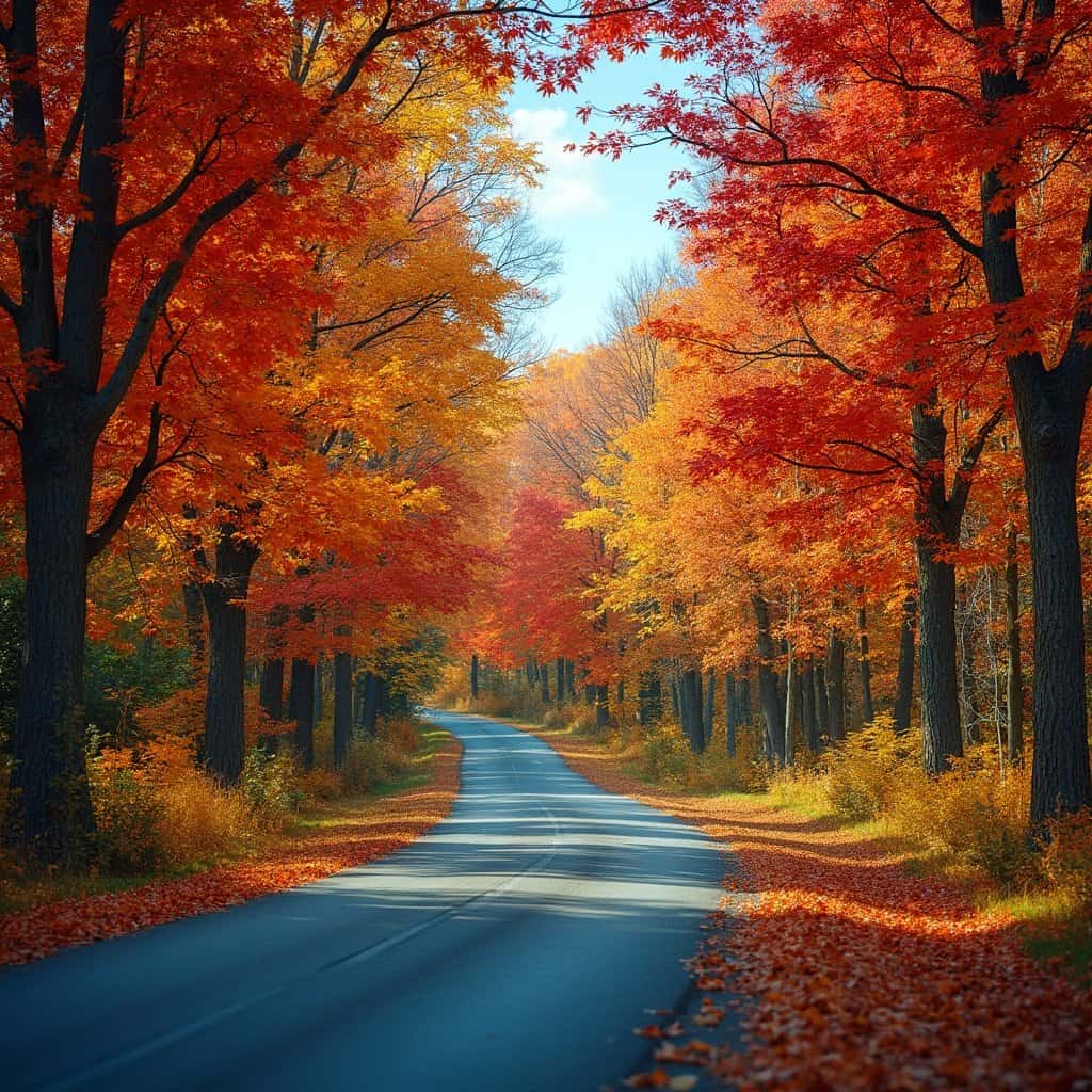 Capture a scenic countryside road lined with trees in their peak autumn colors. Use a wide-angle lens to highlight the depth of the road and f/8 aperture to maintain sharpness throughout the scene. The trees should create a canopy of vibrant oranges, yellows, and reds, while the road leads the viewer’s eye deeper into the image, symbolizing the journey ahead. Focus on the balance between nature’s calm and the excitement of exploring the open road.